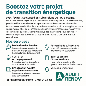 Boostez votre projet de transition énergétique avec l’expertise-conseil en subventions de notre équipe. Nous vous accompagnons, que vous soyez une entreprise ou un particulier, pour identifier et maximiser les opportunités de financement disponibles. Grâce à notre savoir-faire dans les subventions de transition énergétique, nous vous aidons à obtenir les ressources financières nécessaires pour concrétiser vos initiatives durables. Contactez-nous dès maintenant pour bénéficier de notre expertise et donner un nouvel élan à votre projet de transition énergétique. »